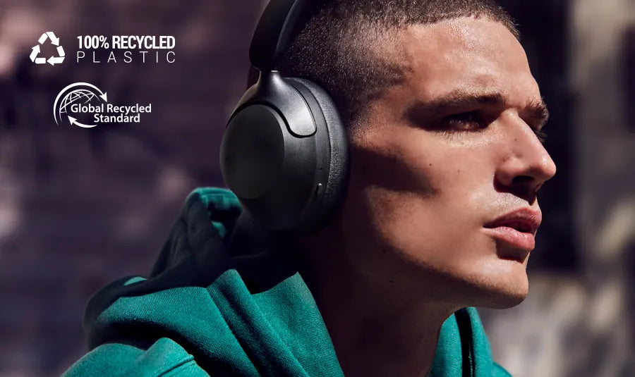 Casque Bluetooth fabriqués en plastique recyclé certifié (GRS) et dotés de la technologie Active Noise Cancelling qui réduit les bruits extérieurs pour un son limpide. Jusqu’à 70 heures d’autonomie et chargement rapide. Coussinets avec finition protéinée et mousse viscoélastique pour un confort et une isolation absolus.Fonctionnalités mises en évidence