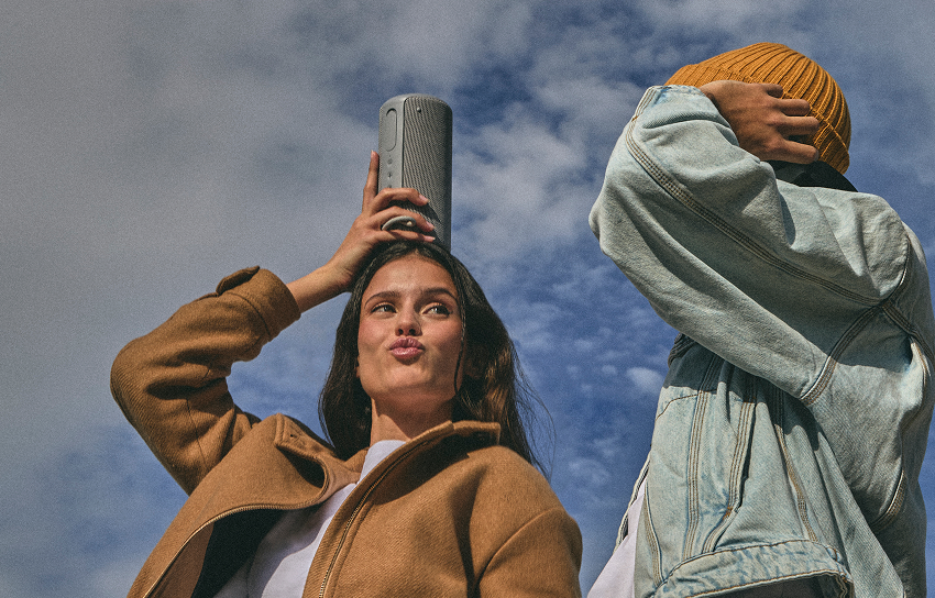Caixa de som de 40 W com Bluetooth 5.4 e True Wireless Stereo. Feita com plástico reciclado, rádio FM e bateria com duração de até 12 horas.