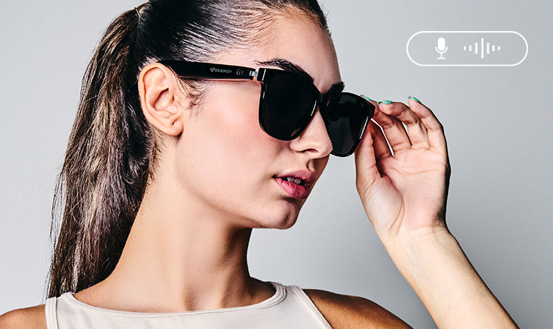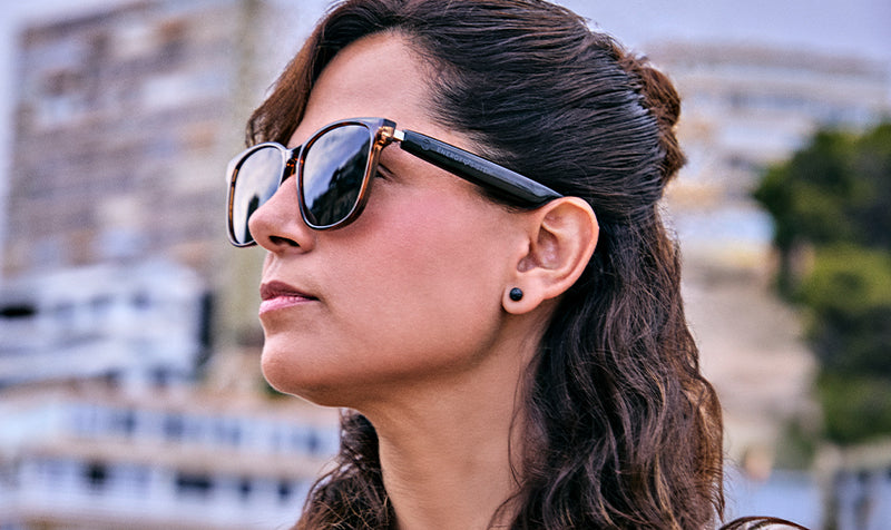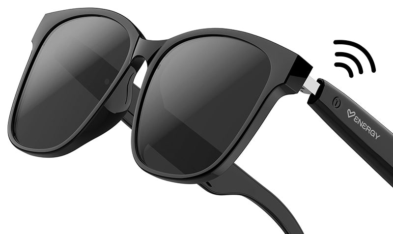 Óculos de sol com lentes polarizadas, proteção UV400+ e filtro para luz azul, com Bluetooth e microfone integrado para ouvir música, atender chamadas ou usar o assistente de voz. Além disso, resistente à água com certificação IPX5.